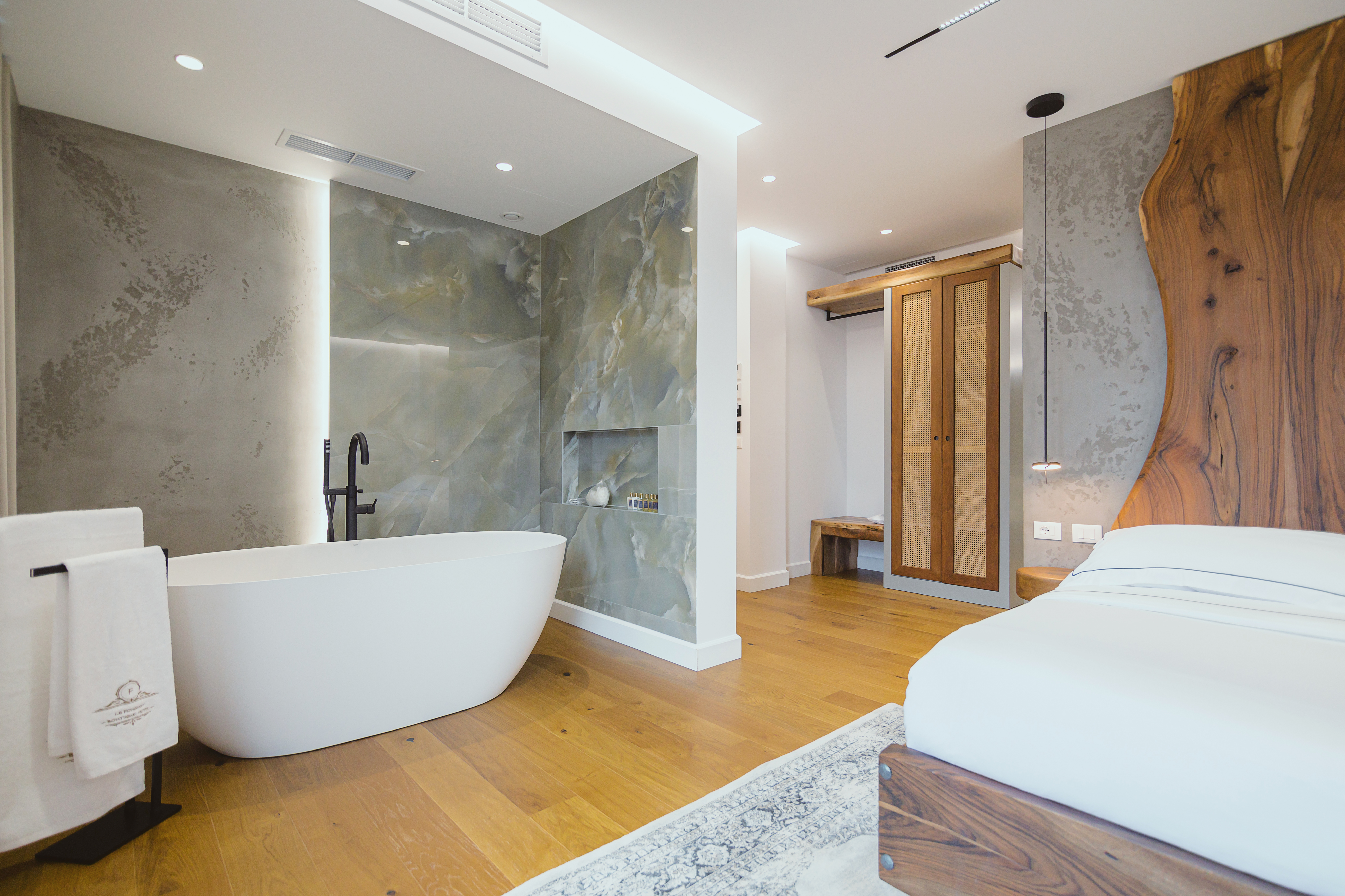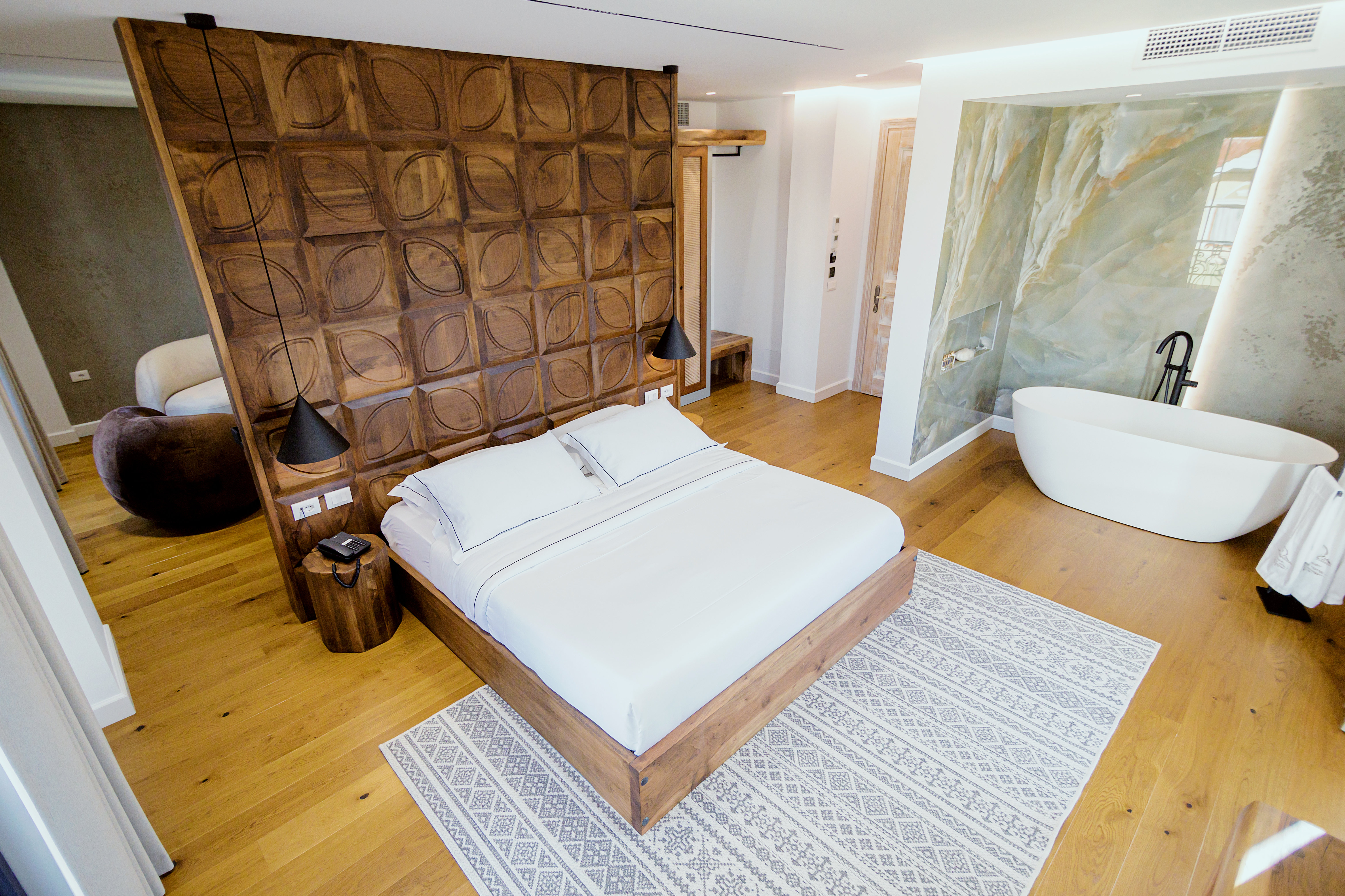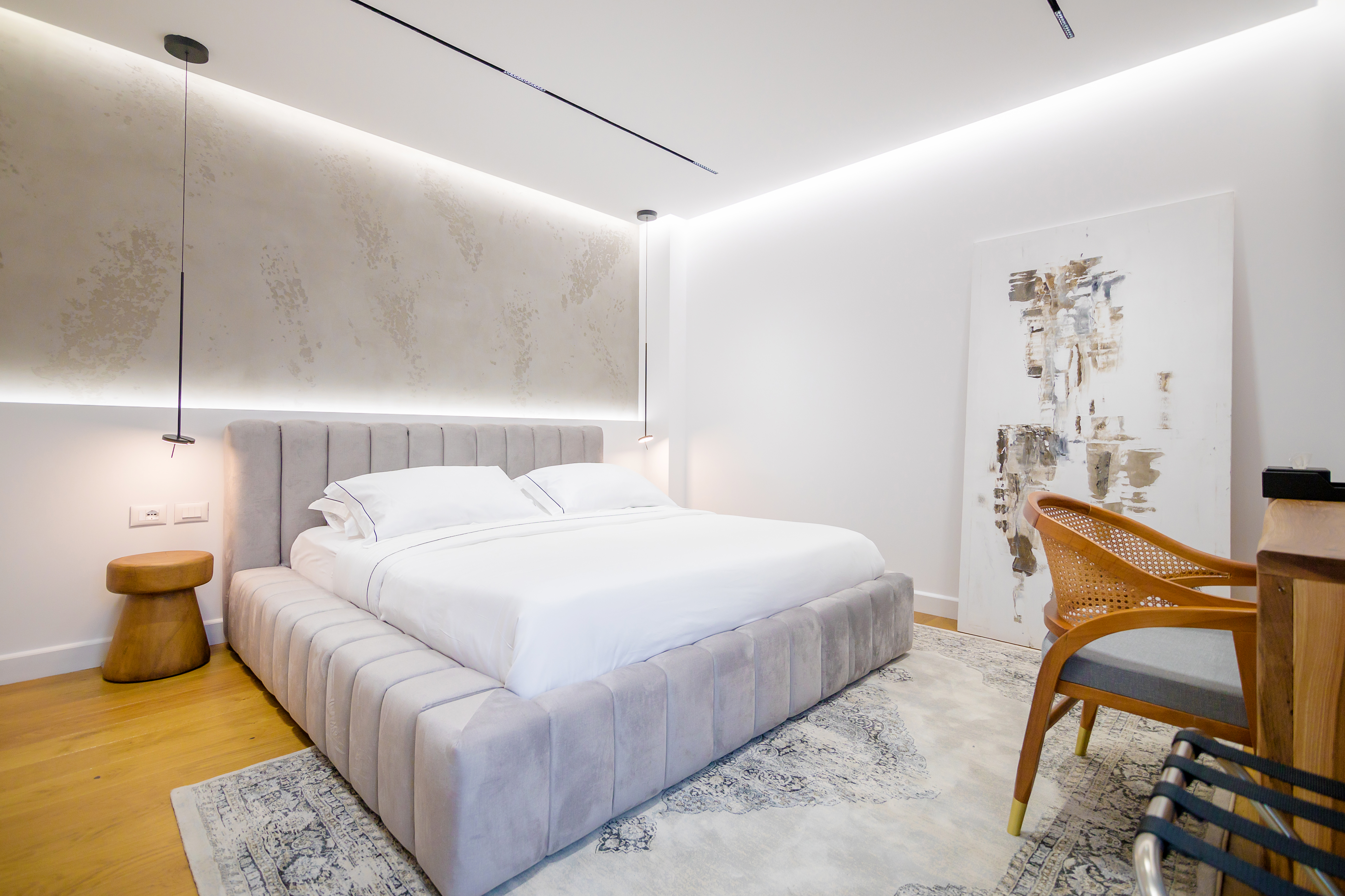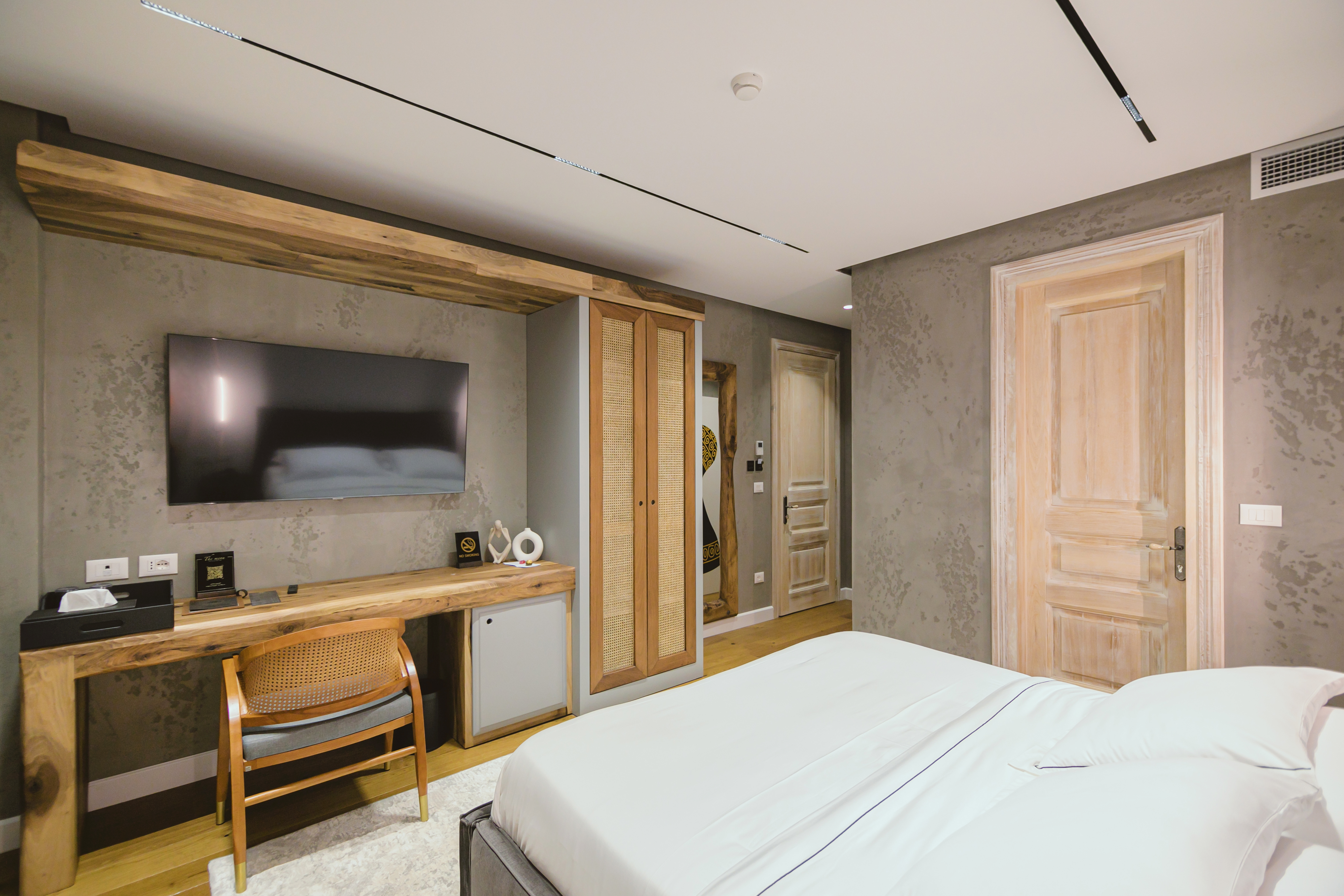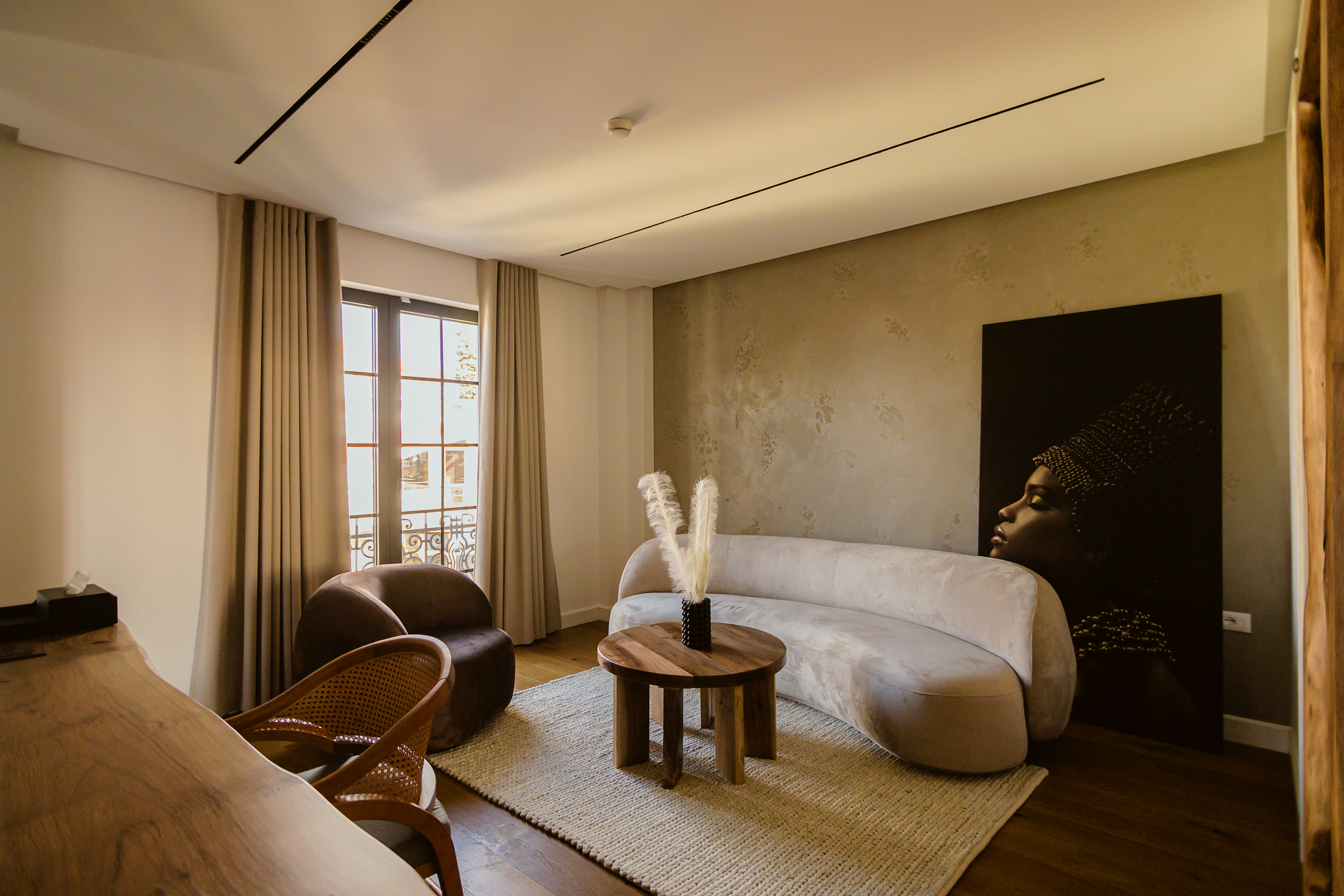 The interior of Le Fouquet hotel is defined by letting letting natural beauty shine. The focus is to create a relaxing atmosphere by highlighting the use of walnut wood, ash-tree wood as well as iron elements.Inspired by the boutique hotels of Paris, but without straying too far from the identity of Korça, the aesthetics of Le Fouquet stands out for its warm color palettes that create a cozy and welcoming atmosphere.