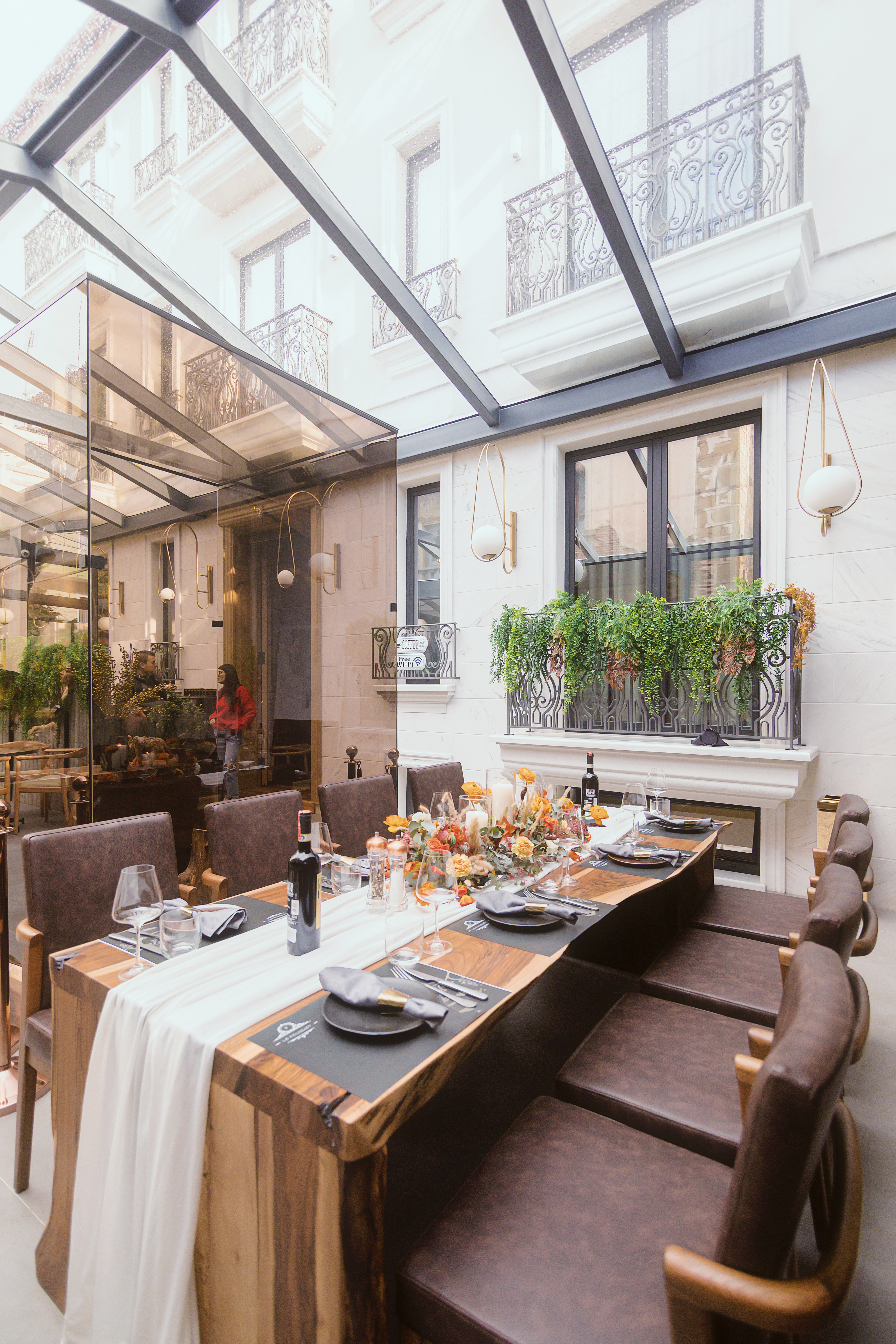 Another special detail is the volume of glass that starts in the restaurant and ends at the reception, which has not only an aesthetic purpose, but also ensures good natural lighting in the restaurant.